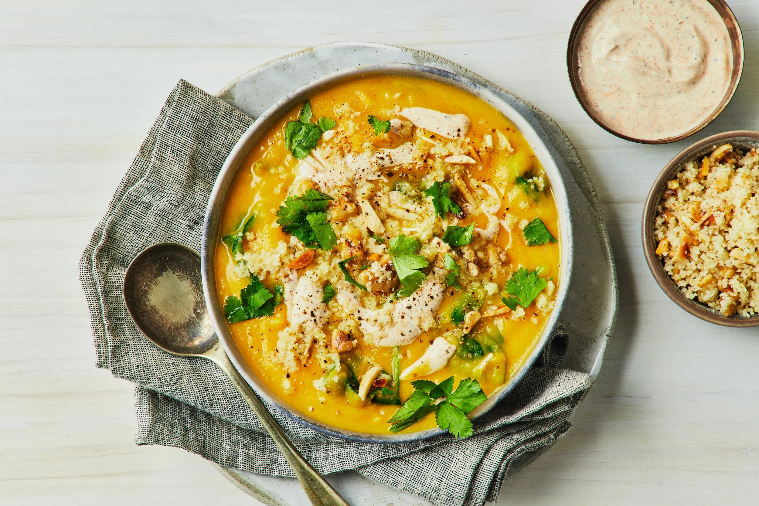 Put the yoghurt, 1 tsp harissa seasoning* (reduce for less of a chilli-kick) and 2 tsp lemon juice in a bowl. Season with salt and pepper and stir to combine. Coarsely chop the coriander, discarding the stems. Divide the soup among bowls and swirl through the harissa yoghurt. Scatter with the nutty burghul topping and coriander to serve.
