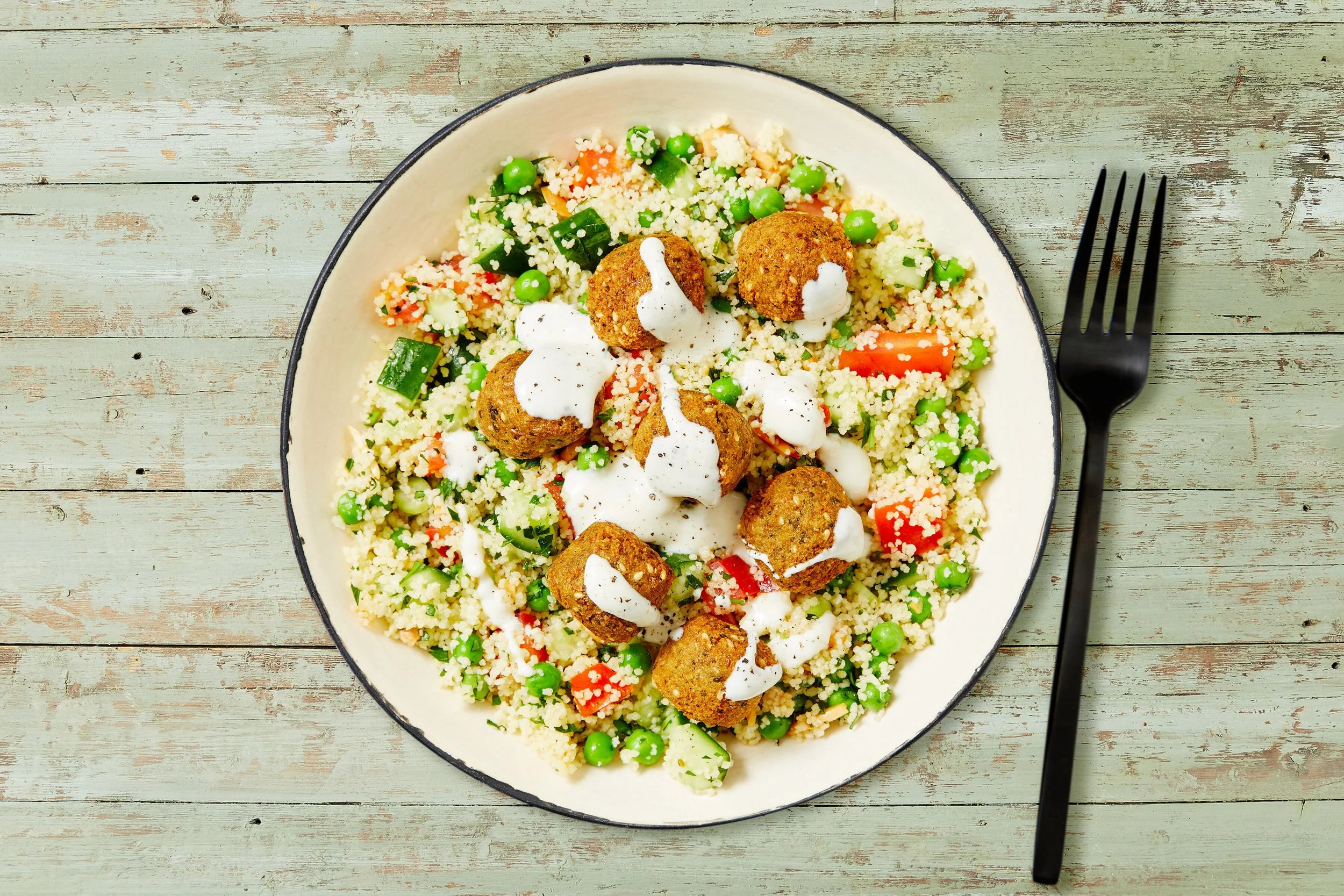 Add the tomato, cucumber, spring onion, parsley, almonds and peas to the couscous. Drizzle with the dressing and toss to combine. Taste, then season with salt and pepper. Divide the couscous, falafels and honey yoghurt among bowls to serve.